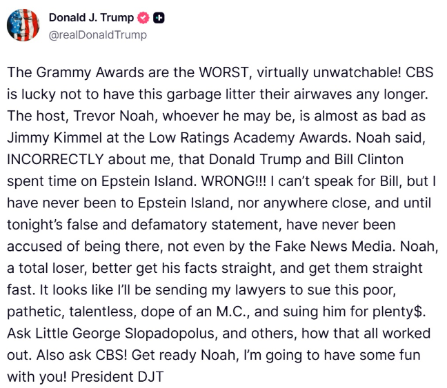 Referring to Grammy Awards broadcast and its host, Trevor Noah, Trump said, “He said that I spent time on Jeffrey Epstein’s island. I didn’t. I have nothing to do with Jeffrey Epstein."