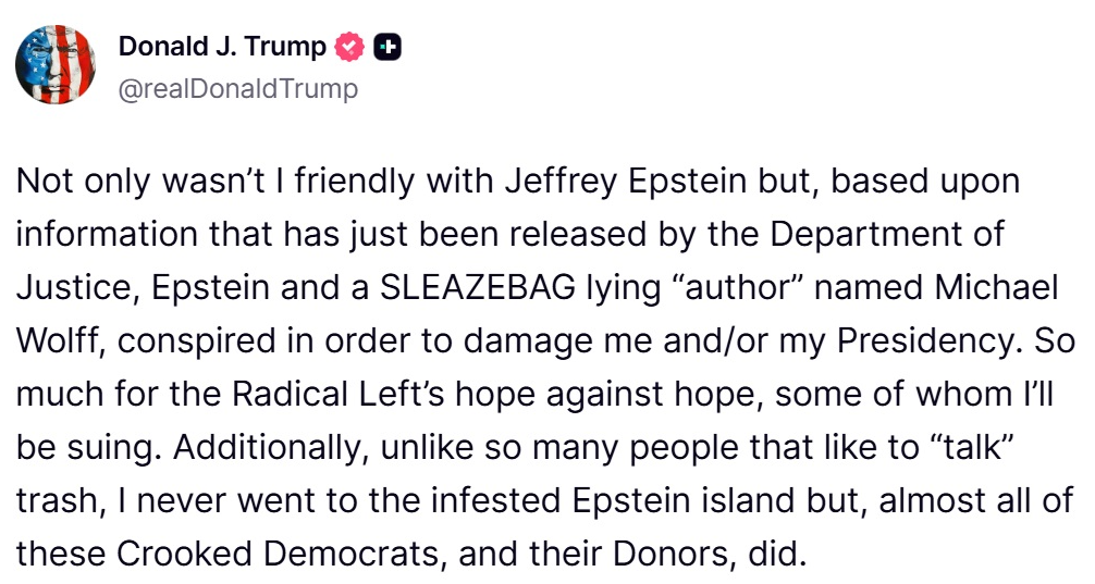 In one, Trump wrote, “Not only wasn’t I friendly with Jeffrey Epstein but, based upon information that has just been released by the Department of Justice, Epstein and a SLEAZEBAG lying ‘author’ named Michael Wolff, conspired in order to damage me and/or my Presidency."
