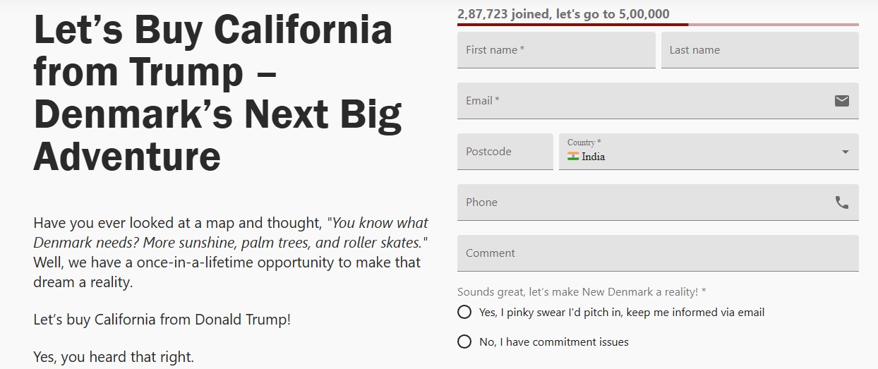 The petition, titled “Let’s Buy California from Trump – Denmark’s Next Big Adventure," was created almost a year ago by a group operating under the banner of Denmarkification.