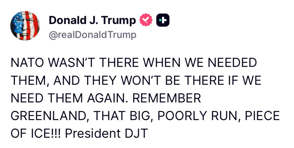 “NATO WASN’T THERE WHEN WE NEEDED THEM, AND THEY WON’T BE THERE IF WE NEED THEM AGAIN. REMEMBER GREENLAND, THAT BIG, POORLY RUN, PIECE OF ICE!!!"