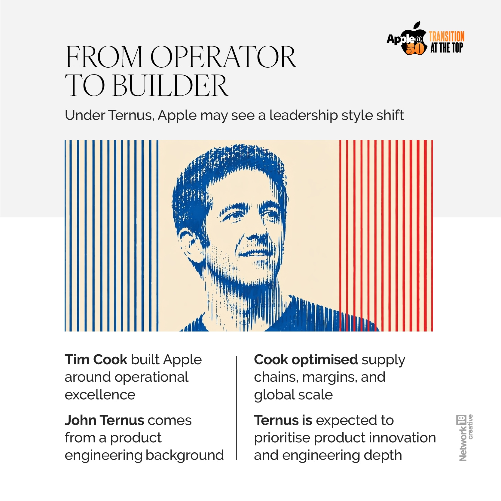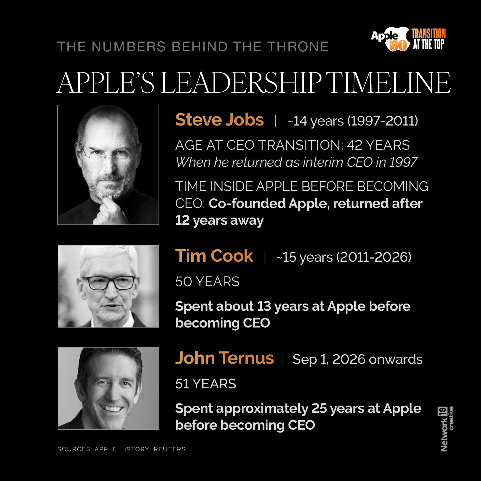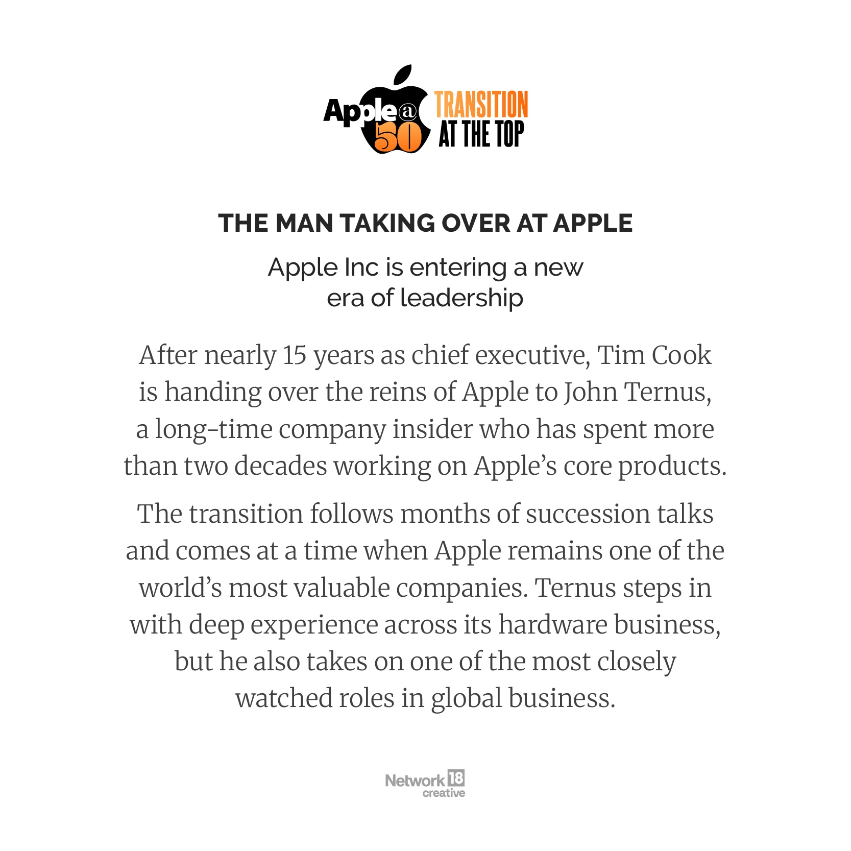 65-year-old Cook, who ran Apple for 15 years after taking the reins from its visionary co-founder Steve Jobs, will be succeeded by Ternus, a senior vice president of hardware engineering