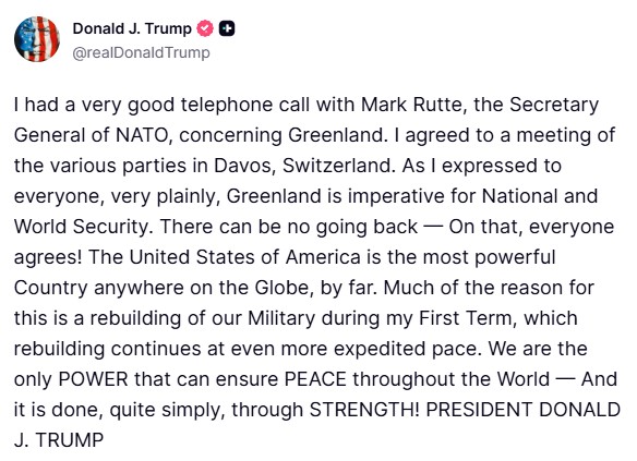 In a post on Truth Social, Trump wrote, “I had a very good telephone call with Mark Rutte, the Secretary General of NATO, concerning Greenland. I agreed to a meeting of the various parties in Davos, Switzerland."