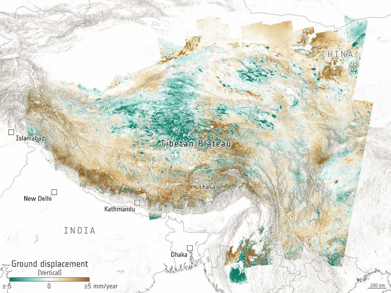 Scientists used high-resolution maps from the Copernicus ‘Sentinel-1’ satellite to track movements across the Tibetan plateau. They found that: