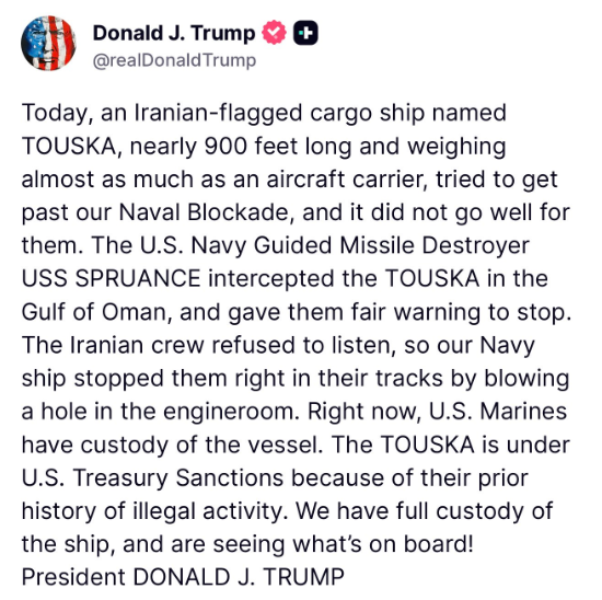 “Today, an Iranian-flagged cargo ship named TOUSKA, nearly 900 feet long and weighing almost as much as an aircraft carrier, tried to get past our Naval Blockade, and it did not go well for them," Trump wrote.