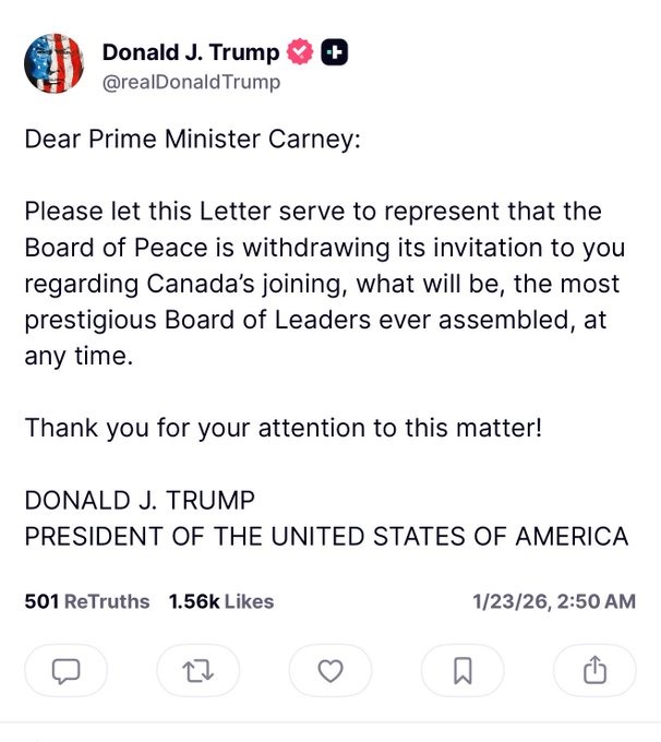 “Please let this Letter serve to represent that the Board of Peace is withdrawing its invitation to you regarding Canada’s joining, what will be, the most prestigious Board of Leaders ever assembled, at any time," Trump wrote.